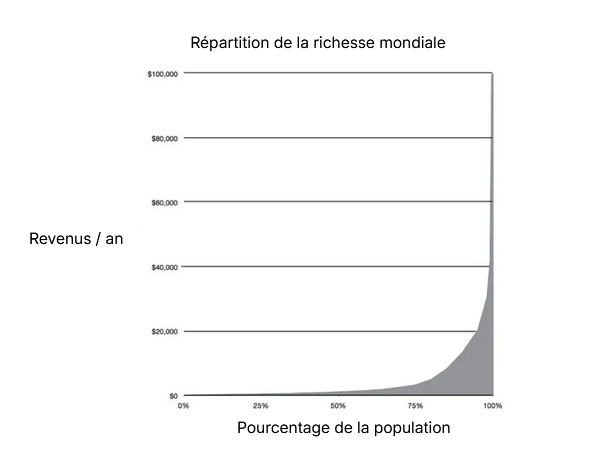 Si on gagne 45 000 euros par an, on fait partie des 1 % des plus riches dans le monde, même en prenant en compte la valeur de l’argent et le coût de la vie dans les pays pauvres. En France, une personne seule, sans enfants, gagnant 9 350 euros par an – un revenu inférieur au seuil de pauvreté français – dispose malgré tout de davantage de ressources que 85 % de la population mondiale.